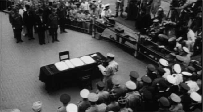 Сегодня, 2 сентября, государственные и военные представители Японии подписали Акт о безоговорочной капитуляции. Разбитая наголову на морях и на суше и окруженная со всех сторон вооруженными силами Объединенных Наций, Япония признала себя побежденной и сложила оружие.