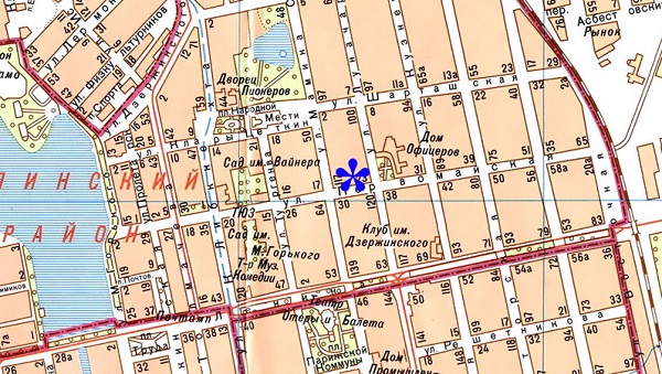 Карта Свердловска с указанием места похищения Герды Грибановой – дома №19 по Первомайской улице.