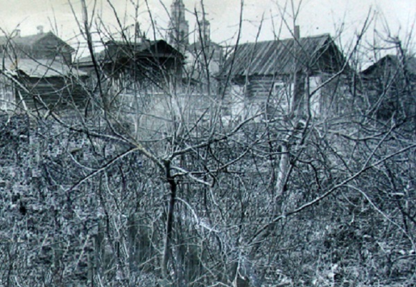 Место обнаружения трупа Герды Грибановой – кусты черёмухи глубоко во дворе дома. Фотография сделана более чем через год после совершения преступления – в октябре 1939 г. Летом 1938 г. кусты росли очень густо, сплошной стеной. Отец пропавшей девочки дважды осматривал их на следующий день после её исчезновения, причём во время второго осмотра рядом с ним бегала собака, которая не почуяла тлена. По мнению Петра Грибанова 13 июля тела там ещё не было, но его соображения на сей счёт сотрудников уголовного розыска не заинтересовали.