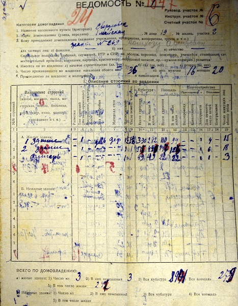 Домовые книги разных времён – настоящий кладезь всевозможной информации о людях, населявших когда-то представляющие интерес адреса. В этих документах не только перечень жильцов с указанием их анкетных данных, но и технические параметры жилья – площадь помещений, высота потолков, год постройки, тип строения и т.п. Это не просто «срез населения» – это воистину «калька эпохи», из которой становится ясно в каких же именно условиях обреталось население. Жуткие без всякого преувеличения коммуналки с десятками семей на общей кухне, уборная во дворе – это мрак, тот, кто не видел подобного бытового ужаса своими глазами и не вдыхал собственным носом, не понял самого главного из эпохи сталинской индустриализации. Хотя объективности ради следует уточнить, что многие в Свердловске той поры вообще жили в землянках и адреса, вроде: «Красная звезда, ул. Плеханова, землянка №20» встречались в паспортах горожан той поры сплошь и рядом. И жители землянок вполне обоснованно завидовали обитателям коммунальных кухонь! Такой вот, понимешь ли, соцреализм, не воспетый почему-то Бабелем, Шолоховым, Фадеевым и иными трубадурами новой эпохи. На фотографиях можно видеть часть сводной ведомости переписи домовладений, относящейся к дому №19 по Первомайской улице Свердловска.