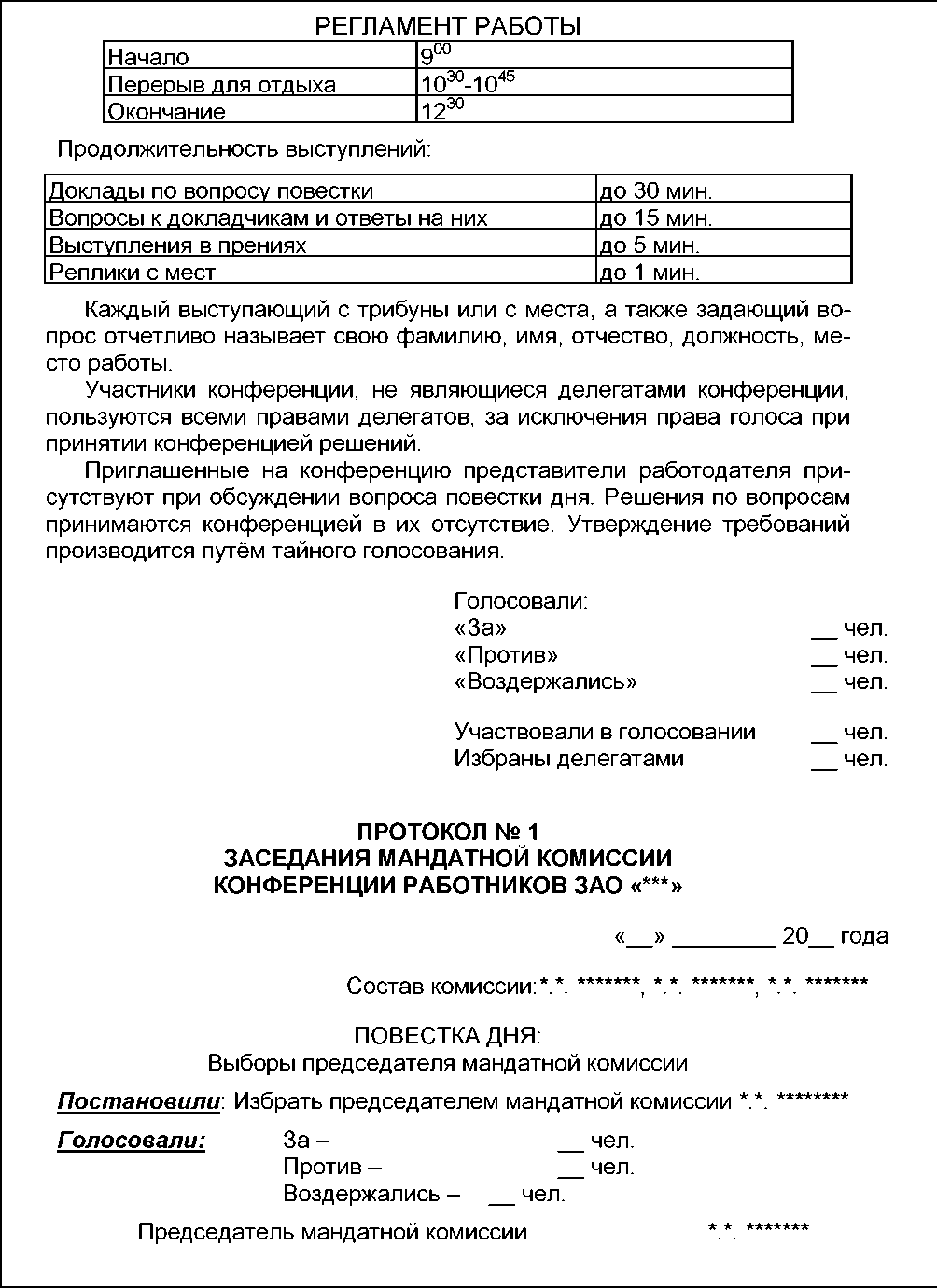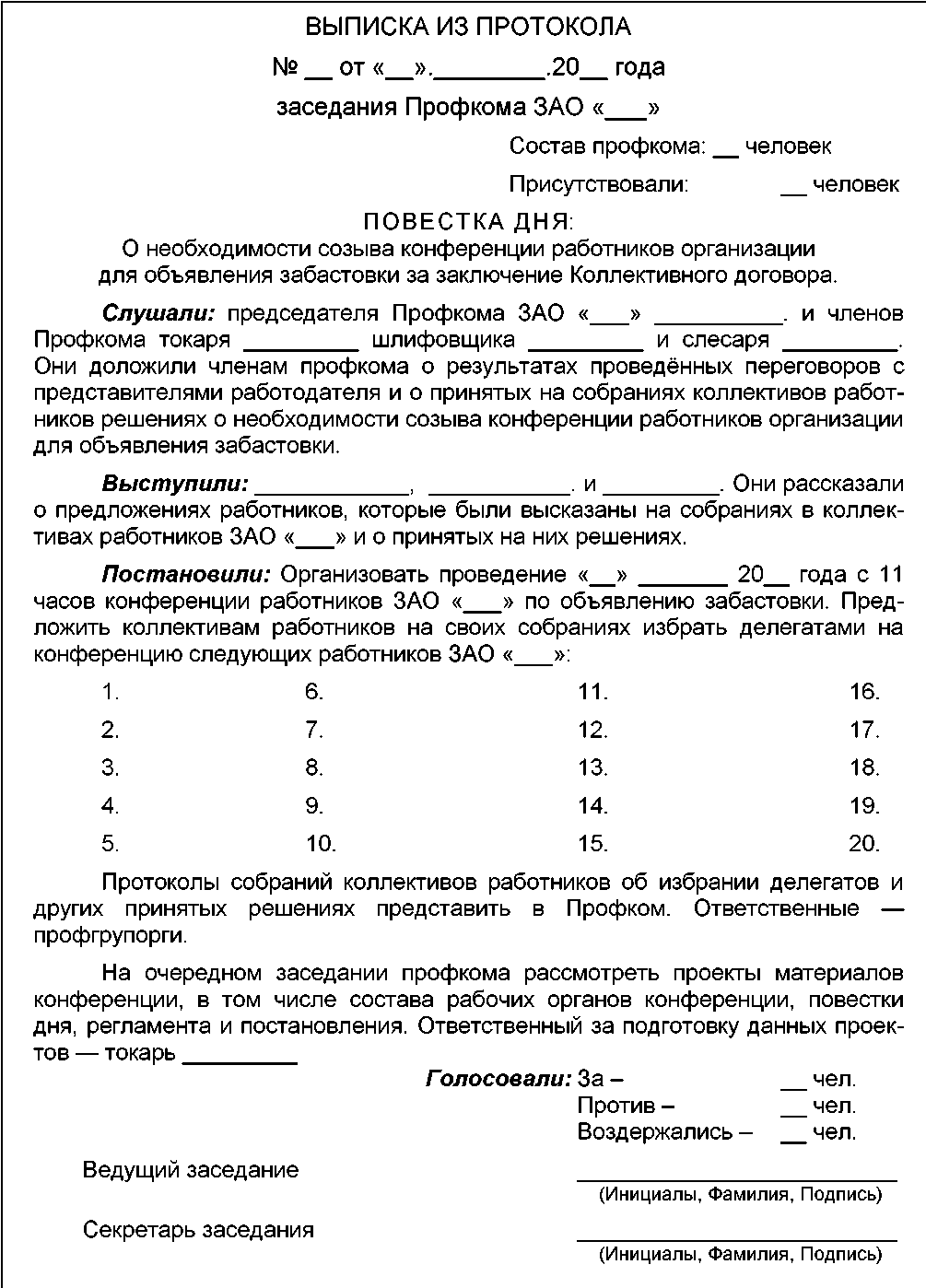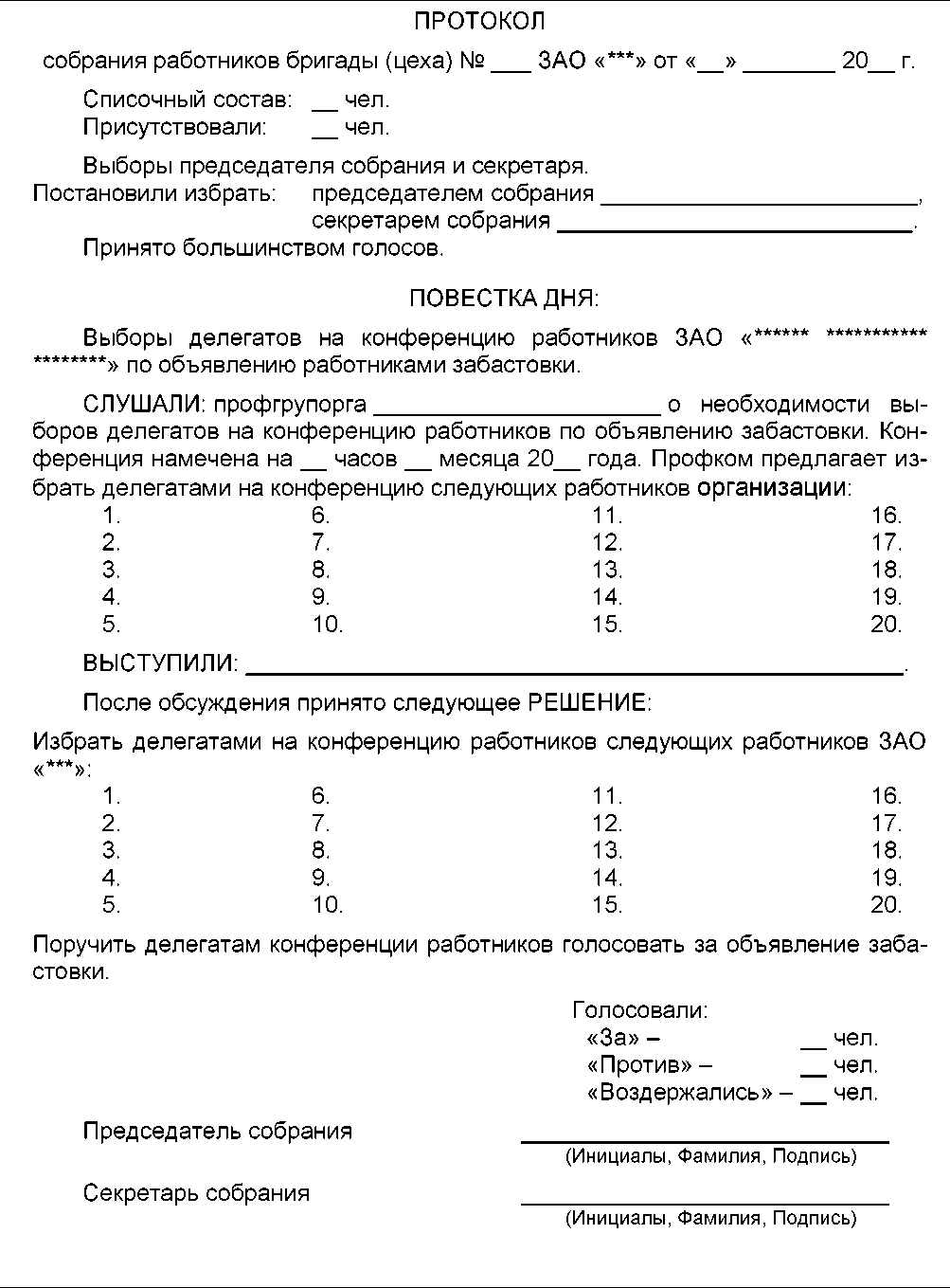 проект Протокола Собрания коллектива работников по выборам делегатов на конференцию об объявлении забастовки
