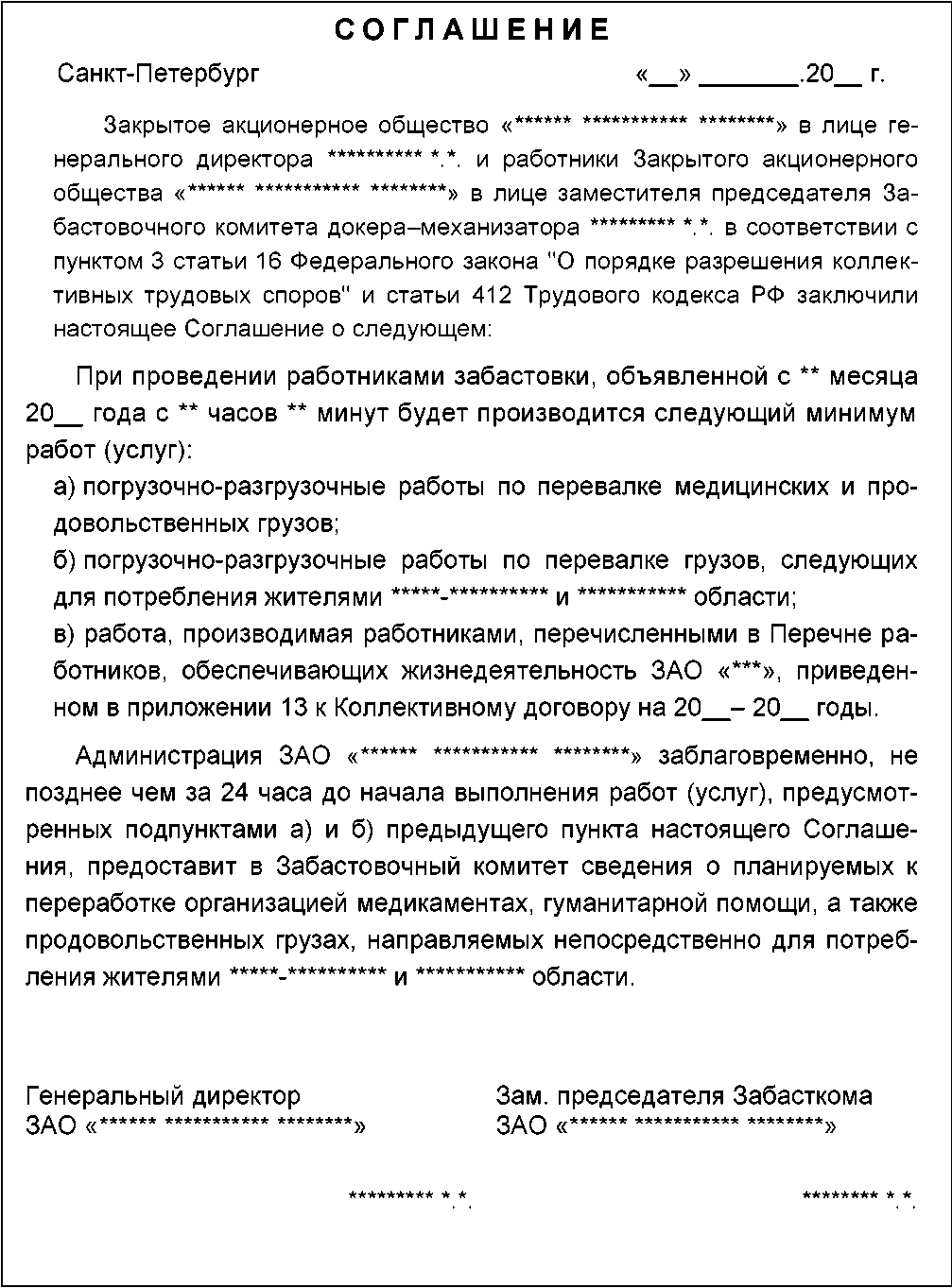 проект Соглашения о минимуме работ, выполняемых при забастовке