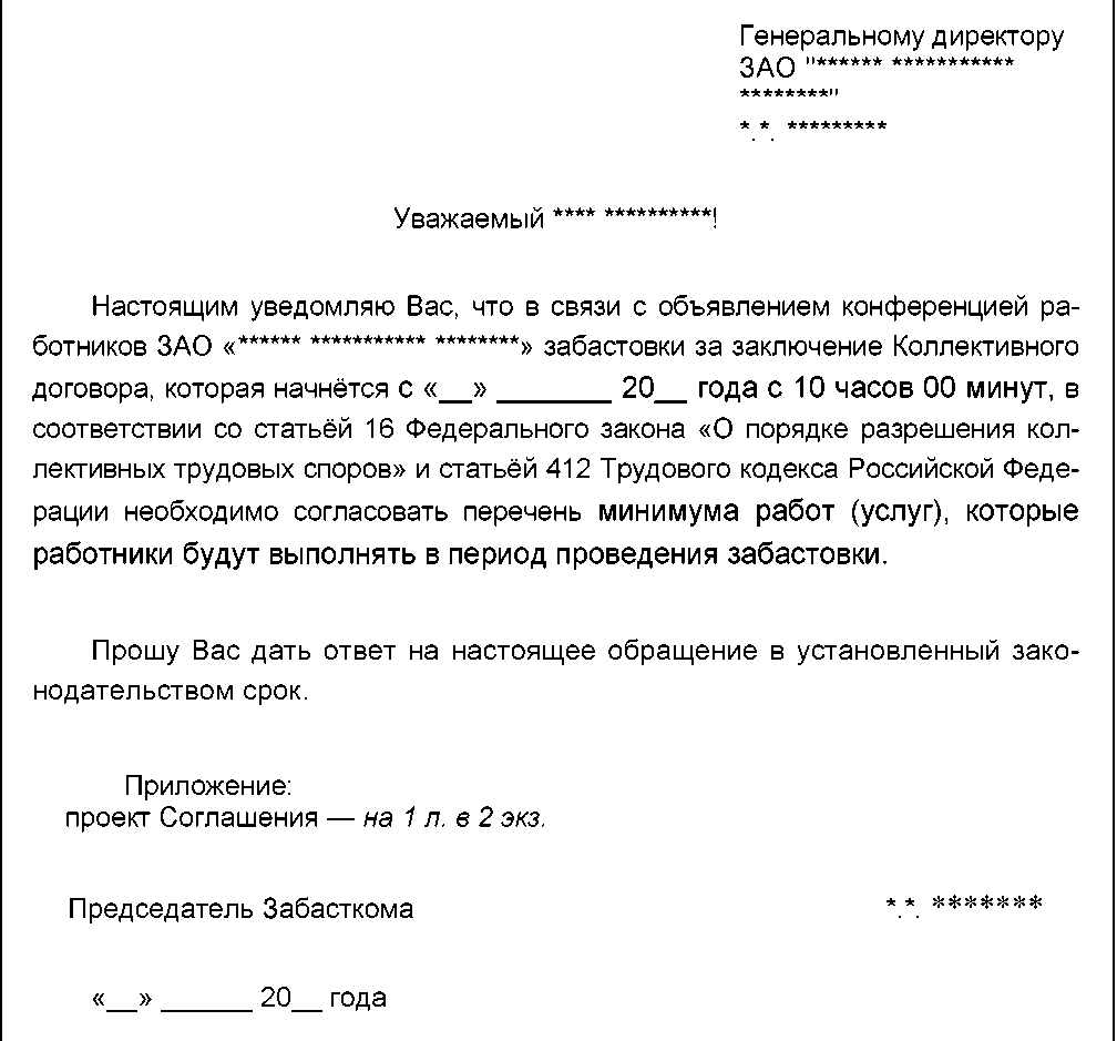 проект письма Забасткома руководителю организации с извещением об объявлении работниками забастовки