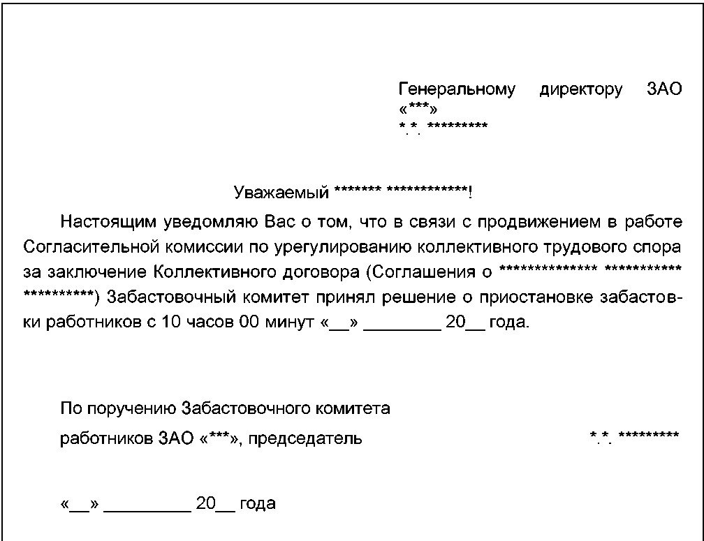 проект Письма Забасткома руководителю организации с уведомлением о приостановке забастовки