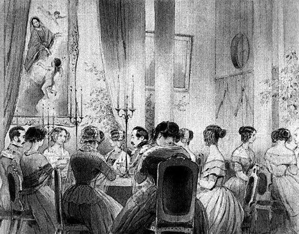 «Развлечения при Высочайшем дворе в Царском Селев 1846 г.». Царскосельский альбом художника Алексея Чернышева. 1848 г. В Малиновой гостиной Императорского дворца. Изображены: Принц А. Гессенский, цесаревна Мария Александровна, великая княгиня Ольга Николаевна, Ю. Ф. Баранова, императрица Александра Федоровна,С. Ф. Апраксин, П. А. Бартенева, великая княгиня Александра Иосифовна, статс-дама Штурмсфедер