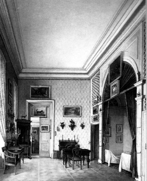 Комнаты родителей над нами остались теми же, что прежде. После, когда теперь покойный цесаревич Никс получил Аничков, он все переделал, и это отсутствие уважения к традициям оскорбило меня. Сашка же и Минни (император Александр III и императрица Мария Федоровна), напротив, относились с уважением к Аничкову дворцу, что делает честь их уму и сердцу. Может быть, будет небезынтересно для истории, если я дам краткое описание комнат наших родителей в Аничковом, как они были обставлены во вкусе 1817 года.