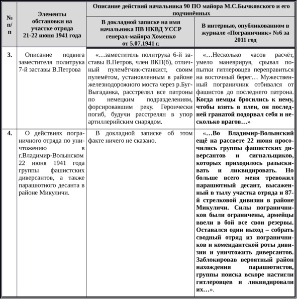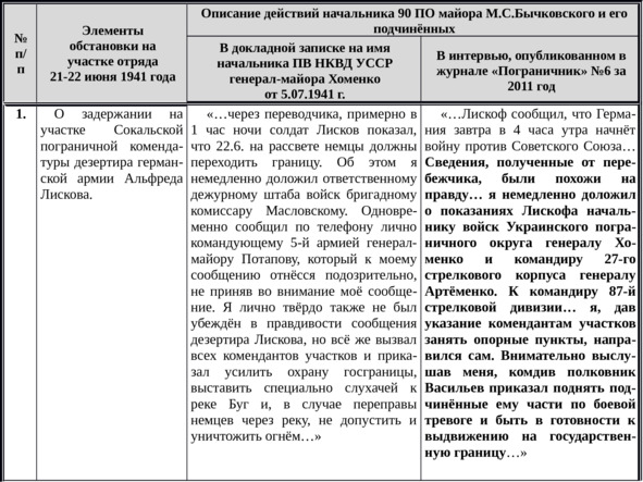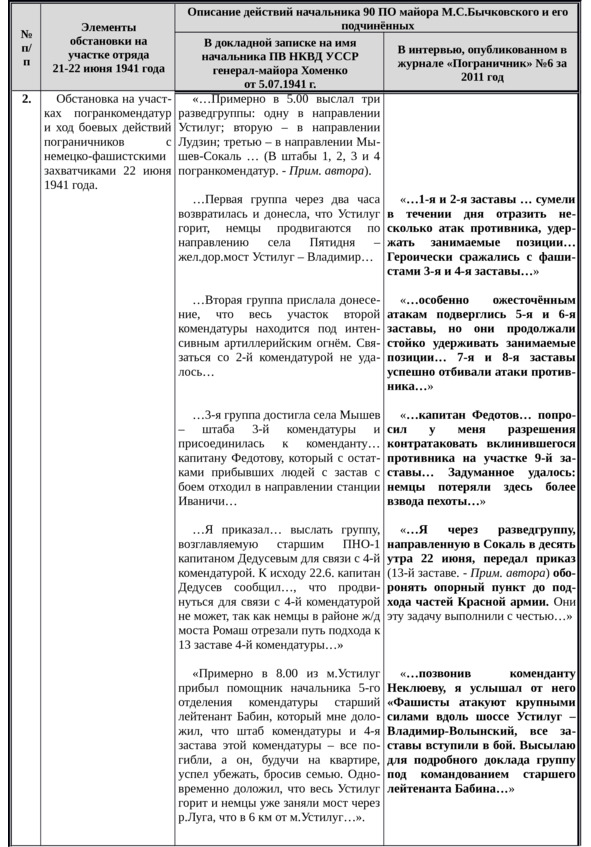 Для удобства я свел основные положения обоих документов в отдельную таблицу, чтобы читателю было легче проследить трансформацию взглядов и оценок уважаемого ветерана на те далекие и трагические события на участке всего лишь одного пограничного отряда. Более тёмным шрифтом выделены те места в послевоенном интервью М.С.Бычковского, которые, на мой взгляд, в наименьшей степени соответствуют его же докладной записке.