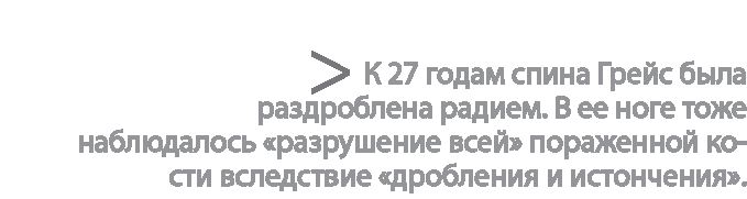 Сложно вообразить, как она отреагировала на новости, которые ей сообщил доктор. «Сделанный тогда рентгеновский снимок, – позже рассказывал Хоффман, – показал, что ее позвоночник разваливается». Спина Грейс была раздроблена радием. В ее ноге тоже наблюдалось «разрушение всей» пораженной кости вследствие «дробления и истончения». Боль наверняка была невыносимой.