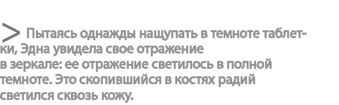 Эдна закричала и упала в обморок. Она прекрасно понимала, что предвещали ее сияющие сквозь кожу кости. Это мерцание было ей хорошо знакомо. Только одна вещь на свете могла сиять подобным образом. Радий.