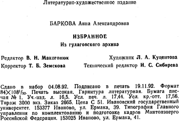 В настоящем же издании предпринята попытка собрать в одной книге наиболее существенное из наследия А. Барковой, сохранившееся в следственных делах в качестве вещественных доказательств ее антисоветской деятельности. Автографы произведений хранятся в литературном музее Ивановского университета. Некоторые из них публиковались в периодических изданиях, однако большая часть гулаговского архива печатается впервые.