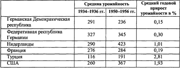 Для Нидерландов, кроме данных «Зарубежных стран», использовано указание И. Якушкина (БСЭ, 1-е изд., 1936, т. 56, с. 276—280), что лучшая средняя урожайность в Западной Европе не выше 390 ц (Голландия, 1933—1934). Мы видим, что кроме Нидерландов, продолжающих улучшать показатели урожайности и сохраняющих первое место, остальные страны Западной Европы не дают существенного роста урожайности за этот период. В общем — около 400 центнеров на га — это в настоящее время верхний предел для средней урожайности. В Бельгии урожайность колеблется в пределах 341—406 центнеров, в Австрии 267—320, в Швейцарии — 305—378.