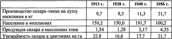 Обратимся теперь к Советскому Союзу. В неоднократно цитированной статье И. Якушкина в БСЭ, 1 издание, в числе выдающихся успехов социалистического земледелия указан рекордный урожай — 631 ц с га для Велико-Половецкого района, по сравнению с которым лучшая средняя урожайность Западной Европы (Голландия, 1933—34, 350 ц) кажется скромной. Вот что писалось в 1936 году. А что сейчас? В Обращении ЦК КПСС («Правда», 17 января 1957 года) указано, что урожайность свеклы продолжает оставаться низкой. В книге «Итоги выполнения пятого пятилетнего плана развития СССР и союзных республик на 1951—55 годы», 1956, на с. 75—76 указано: «Среднегодовой фактический сбор с гектара за 1951—1955 годы повысился по сравнению со сбором за 1946—1950 годы зерновых культур (амбарный урожай) и сахарной свеклы (фабричной) почти в полтора раза». Но 1946—1950 — восстановительные годы и неудивительно, что после них урожайность повысилась. Об абсолютной высоте урожайности свеклы или относительной по отношению к дореволюционному времени эти слова ничего не говорят. Кое-что, однако, можно извлечь из справочника «Достижения СССР за 40 лет в цифрах», 1957 г. Мы получили урожайность не свеклы, а сахарного песка, но так как вся фабричная свекла идет на переработку, то сопоставление этих цифр дает некое указание на колебания урожайности. Сопоставим данные с. 7, 43 и 173 справочника «Достижения СССР» и получим табл. 16. При этом численность населения на 1928 год получена прибавкой к численности на 17 декабря 1926 года среднего прироста населения за полтора года. Я не вполне уверен, что население для 1928 года и 1940 года соответствует современным границам СССР и поэтому эти цифры недостаточно надежны: наиболее надежны цифры за 1913 и 1956 годы.
