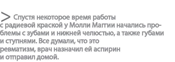 Симптомы «фосфорной челюсти» – как жертвы отравления мрачно прозвали это заболевание – были крайне схожи с наблюдавшимися у Молли: потеря зубов, воспаление десен, некроз, боль. Так что на следующем приеме Кнеф спросил у Молли, чем она занимается на работе.
