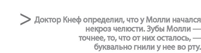 Ей было ужасно, ужасно больно. Молли удалили еще несколько зубов – Кнеф пытался остановить распространение инфекции, избавившись от источника болезненных ощущений, однако полость рта не заживала. В оставшихся от зубов дырках появились еще более неприятные язвы, причинявшие боль сильнее, чем зубы.