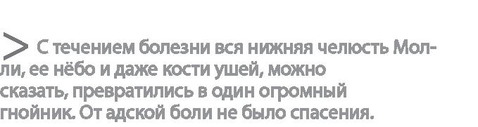 А иначе как разрушительным его было и не назвать. Рот Молли буквально разваливался на части. Она пребывала в постоянной агонии, и лишь местное болеутоляющее могло принести хоть какое-то облегчение. Для Молли, любившей повалять дурака, это было невыносимо. Если раньше ее широкая улыбка сияла на все лицо, то теперь ее было не узнать: все больше и больше зубов выпадало. Впрочем, ей в любом случае было слишком больно, чтобы улыбаться.