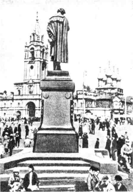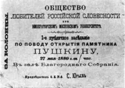 Площадь, бульвар, крыши домов, балконы, окна (несмотря на пасмурное небо и мелкий дождик) — всюду люди. «Колыхались разноцветные значки и знамена различных корпораций, обществ и учреждений; вокруг площадки памятника на шестах поставлены были белые щиты, на которых золотом вытиснены были названия произведений великого поэта; Тверской бульвар был украшен гирляндами живой зелени, перекинутой над дорожками…»