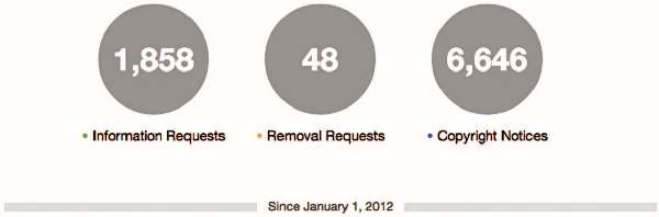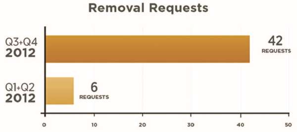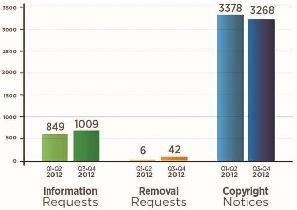 Большую часть всех запросов в администрацию сайта составляют обращения, касающиеся авторских прав. Во втором полугодии 2012 года их было несколько меньше, чем в первом, однако процент положительных решений по обращениям вырос с 38 % (первое полугодие) до 53 % (3 и 4 квартал 2012 года). Кроме того, увеличилось число пользователей, вовлеченных в дела по данным запросам, с 5874 аккаунтов в первом полугодии 2012 до 7205 во втором. Кроме того, почти в 3 раза увеличилось количество медиафайлов, подлежащих удалению: с 599 в 1 полугодии до 1648 во втором.
