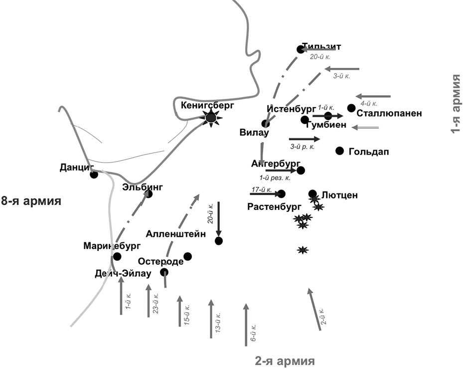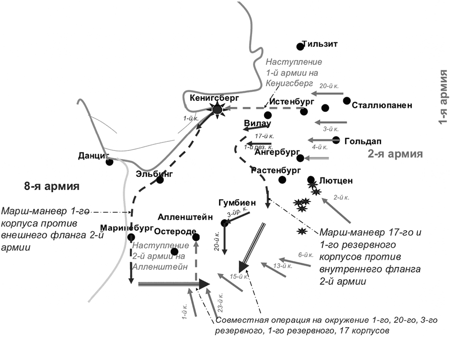 Между тем 1-я армия просто не могла быстро двигаться вперед. Я. Ренненкампф понимал, что германские войска не были разбиты в Гумбиенском сражении, и полагал, что они в любой момент могут контратаковать, опираясь на Кёнигсберг и, возможно, используя в качестве подкреплений части гарнизона крепости. Опыт боев под Сталлелюпаненом и Гумбиеном показал, что оперативное взаимодействие русских войск оставляет желать лучшего даже в масштабе корпуса, не говоря уже об армии. В такой ситуации огульное наступление приводило 1-ю армию в промежуток между Кёнигсбергом и Лютценом, куда ее корпуса приходили бы несогласованно. В подобных условиях трудно требовать от Я. Ренненкампфа быстрого движения к западу, скорее, следует ожидать, что он будет равнять корпуса по одной линии (то есть ориентироваться на отстающие части) и приложит все усилия для того, чтобы обезопасить себя со стороны Кёнигсберга. Надо также учесть, что довоенные прикидки и проведенные стратегические игры однозначно показывали, что 1-я армия вырывается вперед и подвергается риску изолированного поражения, в то время как 2-я армия отстает и портит этим всю геометрию операции.