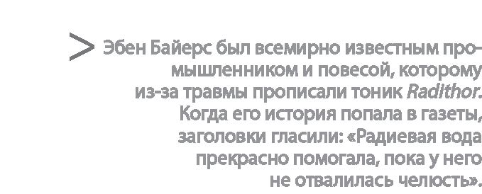 Весь март о ней трезвонили газеты. Байерс был всемирно известным промышленником и повесой; богачом, владевшим скаковыми лошадьми и жившим в «великолепном доме»: он был большой и важной знаменитостью. После того как в 1927 году он получил травму, врачи прописали ему тоник Radithor; Байерса он настолько впечатлил, что он выпил в общей сложности несколько тысяч пузырьков. Когда его история попала в газеты, заголовки гласили: «Радиевая вода прекрасно помогала, пока у него не отвалилась челюсть».