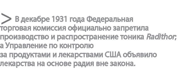 Власти отреагировали с куда большим рвением, чем в случае с красильщицами циферблатов. В декабре 1931 года ФТК официально запретила производство и распространение тоника; а Управление по контролю за продуктами и лекарствами США объявило лекарства на основе радия вне закона. Наконец, Американская медицинская ассоциация исключила применение радия внутрь из своего списка «новых и неофициальных лекарственных средств», где он оставался даже после того, как стало известно о смертях красильщиц циферблатов. Видимо, обеспеченные потребители в большей степени заслуживали защиты, чем девушки из рабочего класса; в конце концов, циферблаты по-прежнему расписывали светящейся краской, хотя на дворе был уже 1933 год.