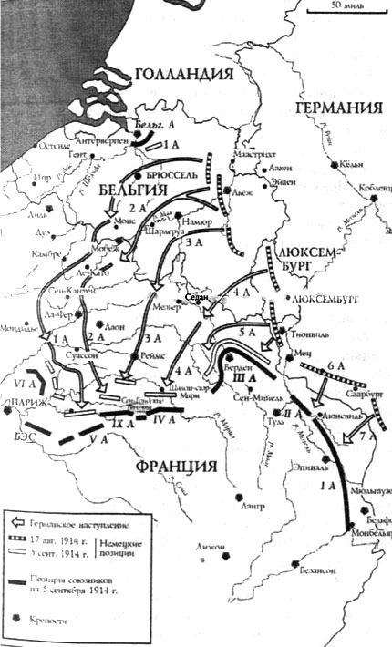 Как справедливо замечает М. Галактионов, складывается впечатление, что какая-то сила «тянет» немцев к востоку и югу. Все германское войско втягивается в промежуток между Парижем и Верденом и двигается вперед, имея на флангах крепостные районы.