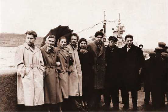 Все развивалось как-то естественно, в десятом классе появились девочки, знакомые либо по дому, либо по двору – дворовые девочки. Мы собирались по домам, танцевали, особенно танго было популярно, были выпита и первая бутылка вина. До сих пор мы время от времени встречаемся; все достойно прожили жизнь, овладели профессиями, создали семьи, помогают теперь растить внуков. Я был дружен с моей соседкой по лестнице Валей Длугач, ее отчим Длугач М. А. был директором оставшейся в Ленинграде после эвакуации части Кировского завода. Как-то её мать уже после войны рассказывала, что накануне у нее были в гостях Уланова с Сергеевым, и очень сокрушалась, что они не смогли отведать всех приготовленных ею яств, поскольку им предстояло выступление. Вообще наш дом не был обойден знаменитостями, например, с шестого этажа часто слышались звуки трубы, это репетировал солист оркестра Эдди Рознера. Бросалась в глаза очень броская для тех времен манера одеваться его жены, джазовой певицы. Но в целом атмосфера была довольно демократичная, многие знали друг друга, общались.
