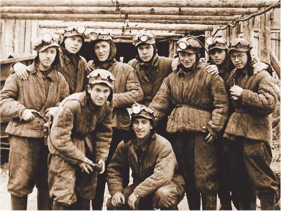 Хорошо выбраться на солнце из шахты! (Слева направо стоят: Яша Шульман, Серов, Боря Гусев, Борис Лашков, Боря Николаев, Демьянович, Боря Даев; сидят: Боря Стеблов и Миша Фишман)