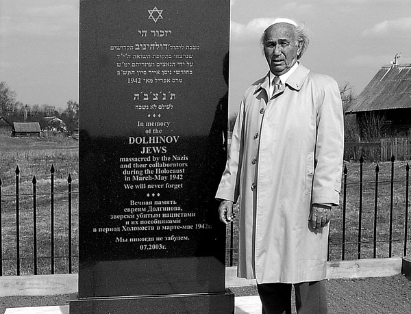 Шимон Хевлин у памятника погибшим евреям в Долгинове. 2007 г.