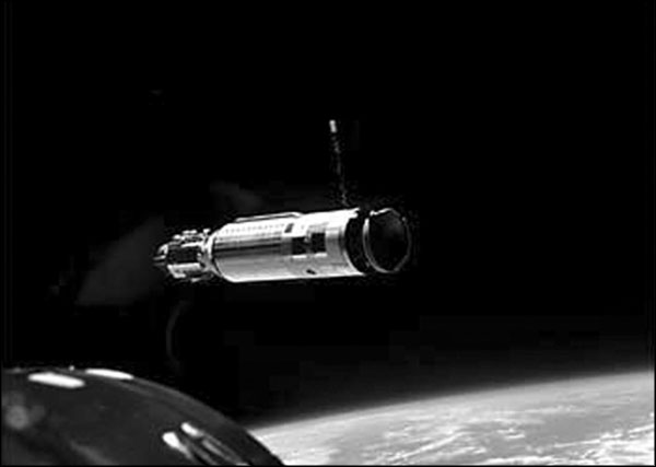 Первую в мире стыковку в космосе выполнил 16 марта 1966 года как раз «Джемини-8», которым командовал Нейл Армстронг, – да-да, тот самый! (Вторым членом экипажа «Джемини-8» был Дэвид Скотт; впоследствии он был командиром «Аполлона-15» и тоже побывал на Луне.) Фото на рис. 122 сделано незадолго до этой стыковки, когда «Джемини-8» приближался к последней ступени ракеты «Аджена», с которой он потом состыковался (эта ступень – в центре кадра). (Кстати, Армстронг в этом полете с честью вышел из весьма опасной ситуации. Когда стыковка была успешно выполнена, связка «Джемини» – «Аджена» вдруг стала вращаться. Армстронг решил, что виновата «Аджена», и быстро расстыковался с ней – но вращение лишь усилилось. Потом оказалось, что один из двигателей системы ориентации на «Джемини-8» почему-то стал постоянно работать и закручивал корабль. Армстронг полностью отключил систему ориентации – и забарахливший двигатель в том числе – и сумел погасить вращение корабля с помощью второй системы двигателей ориентации, которые предназначались для использования только на этапе входа в атмосферу.)