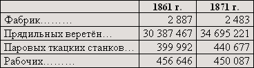 Мы видим, что одновременно с уменьшением числа занятых рабочих произошло уменьшение числа фабрик и увеличение прядильных и ткацких машин, а это — признак централизации накопления капитала.