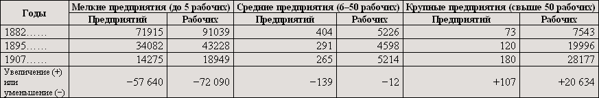Число рабочих шелкоткацкой и льноткацкой промышленности вместе уменьшилось за 25 лет на 60 540 человек, но это уменьшение происходило только за счёт упадка мелкого производства: в обеих отраслях промышленности число мелких предприятий уменьшилось на 88 868, или на 80%, а число рабочих в них — на 116 959. Напротив, число крупных предприятий увеличилось со 142 до 420, т. е. почти утроилось, а число рабочих в них возросло с 21 123 до 76 896 человек, т. е. больше чем в три раза.