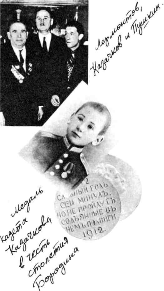 Путь в армию Владимир Алексеевич Казачков начал, можно сказать, с детских лет: «Я был кадетом первого Московского кадетского корпуса». Подчеркнул — первого. Оказалось, что с ним вместе, но только в старшем классе, учился правнучатый племянник Лермонтова Петр Николаевич Лермонтов. Военная биография Казачкова складывалась так: с 1919 по 1923 год — красноармеец; с 1941 по 1957 год — офицер Советской Армии. «Штатскую часть жизни» Владимир Алексеевич проработал на первом Государственном подшипниковом заводе в главной бухгалтерии старшим бухгалтером по учету основных фондов. А все свое свободное время (особенно после выхода на пенсию в 1970 году), всю свою любовь он отдавал и продолжает отдавать суворовцам и музею-панораме «Бородинская битва», членом ученого совета которого является.