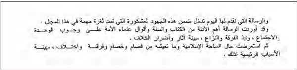 Сочинение, которое мы теперь предлагаем вашему вниманию, вписывается в рамки похвальных усилий по противодействию этой болезни. Ибо в данной книге собраны важнейшие доказательства из Корана и Сунны [книги преданий, унаследованных от Мухаммеда], равно как и цитаты улемов Уммы [всемирной общины правоверных], касающиеся необходимости единства и сплоченности и отказа от всякого раздора и конфликтов и объясняющие нам пагубные последствия разъединения.