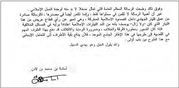 Этот текст, снабженный подписью Бен Ладена, был написан как предисловие к книге-справочнику по джихадистскому движению под названием «Исламское действие: необходимость объединения и сеятели раздора». Данная книга является коллективным сочинением, изданным в одной из «творческих лабораторий» Аль-Каиды – в «Центре по изучению ислама и исламским исследованиям», находившемся в Пакистане.
