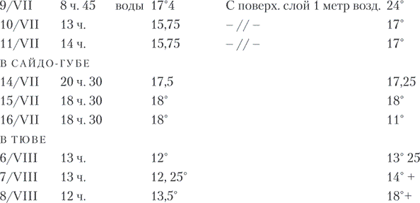 18/VIII. в 5 ч утра в Порт-Влад. Осмотрели губу, оказалось, что вместо сельдей служащими обнаружены пертуи[279]. Погода изменяется. Подул ветер N с дождём. В 10 ч пошли в Уру-губу. В 5 ч. вечера вернулись из Уры.