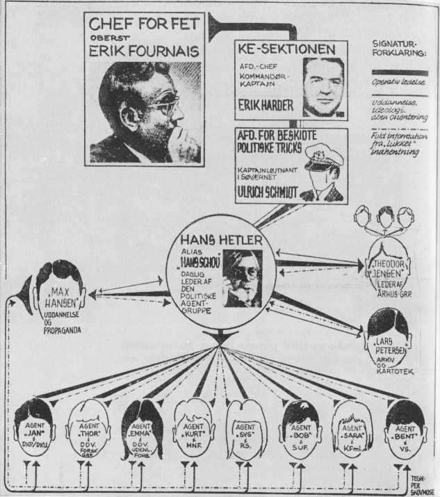 Схема датской военной контрразведки, где, как явствует, Хетлер играл не последнюю роль. Его фотография в центре круга.