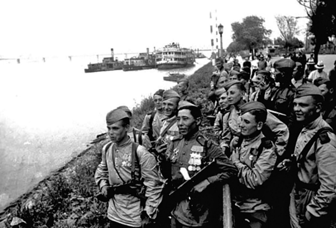 «И на Тихом океане свой закончили поход». Август – сентябрь 1945 г. Второй слева – предположительно, гвардии старший сержант Нигматулин, кавалер трех орденов Славы
