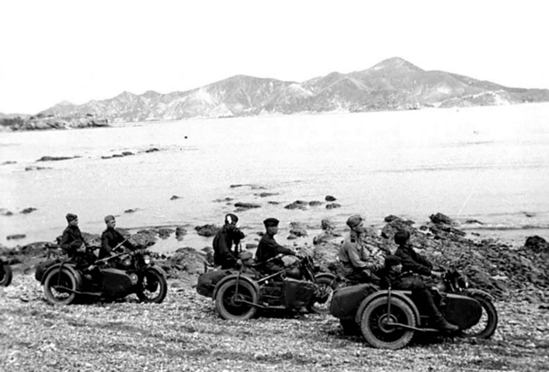 Советские мотоциклисты у побережья Тихого океана. Август 1945 г.