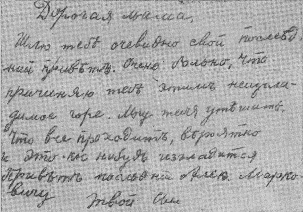 Предсмертная записка, посланная И. Дубинским матери из контрразведки