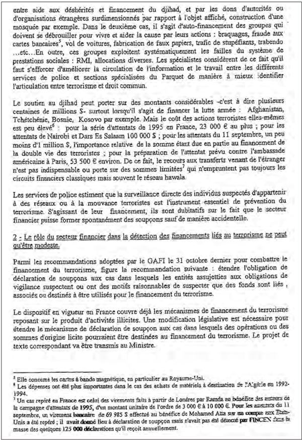 Этот экспертный доклад сделала в январе 2002 года заведующая бюджетным департаментом Анна Ле Лорье по просьбе тогдашнего министра финансов Лорана Фабиуса. И там, в частности, раскрывается тот факт, что сомнительный денежный перевод на сумму 69 985 долларов, отправленный в пользу Мухаммеда Атты, предводителя смертников, осуществивших теракты 11 сентября, был замечен, и сигнал о нем был отправлен в FinCEN (Financial Crimes Enforcement Network) – структуру, занимающуюся борьбой с отмыванием денег в США. Но данная информация была потеряна в общей громадной массе из 125 000 сообщений о подозрениях, получаемых этой конторой каждый год!