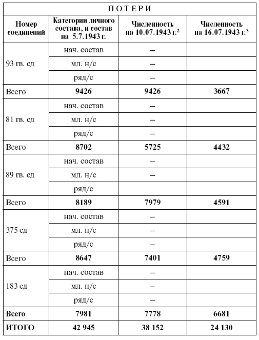 Сведения о потерях стрелковых соединений 48 ск 69-й армии с 1 по 16 июля 1943 года (по данным оперативного отдела штаба армии на 16 июля 1943 г.)[801]