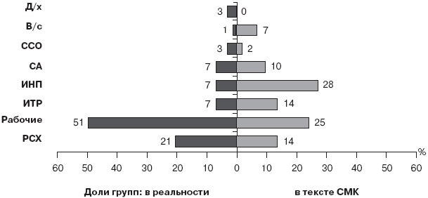 Рис. 6.6.Отражение субъекта социальной деятельности в тексте СМИ в 2000 гг. по данным переписи 2002 г. (n = 112 323 тыс., находящихся в трудоспособном возрасте) и поданным исследования «Анализ содержания „АиФ“ и „НГ“ (n = 3257 упоминаний личностей)