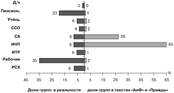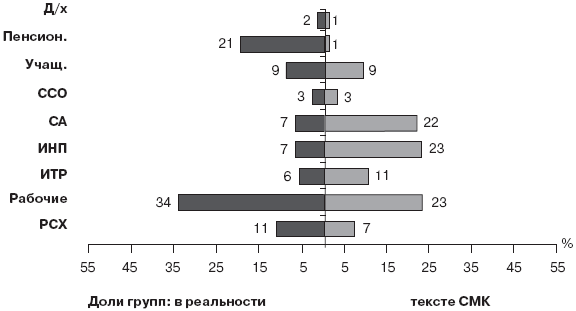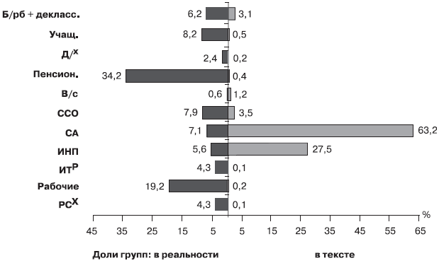 Рис. 6.4.Отражение субъекта социальной деятельности в тексте СМИ в 1990-91 гг. по данным генсовокупность по переписи 1989 г.) и по данным исследования «Анализ содержания „АиФ“ и „Правды“ Всесоюзного зондажа 1991 г. (n = 3892 субъектов деятельности с данными социально-профессиональными группам)