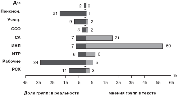 Рис. 6.7.Отражение субъекта мнений в тексте СМИ в 2000 гг. по данным исследования «Анализ содержания „АиФ“ и „НГ“ (n = 1011 выразивших мнения личностей)