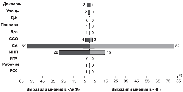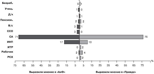 Рис. 6.5. Отражение структур субъектов выраженного общественного мнения (высказавших оценку социальных событий) в «Правде» и «АиФ» в 1990/91 гг. (n = 1496 субъектов деятельности и 419 субъектов выраженного мнения)