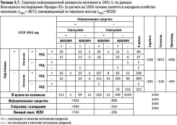 Так что отчуждение от институтов информационной структуры резко возрастает. Надо сказать и о том, что по Всесоюзному исследованию «Правда»-77» объем абсолютной «не-аудитории» отечественных средств массовой информации и пропаганды составлял 2,5 %. Из табл. 3.7 ясно, что он увеличился до 12,6 %. Кроме того, в исследовании 1977 г. прием информации зарубежных радиостанций, которые глушились, вело 14,7 % населения страны. Доля фактически осталась неизменной и через полтора десятка лет. В 1977 г. было обнаружено, что в «не-аудиториях» отечественных газет, радио, телевидения встречаются соответственно 0,7 %, 0,6 % и 0,9 % людей, которые слушают зарубежное радио. В абсолютной «не-аудитории» отечественных средств 1977 г. (на выборке в 9366 чел.) таковых обнаружено не было. В 1991 г. их объем составлял 0,3 %. Если в 1977 г. каналы зарубежных радиостанций выполняли информационную роль трансляции дополнительной информации, нехватка которой ощущалась в отечественных СМИ, то с 90-х годов они приобретают персональную аудиторию, границы которой к нашему времени расширяются.