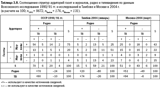 По ответам москвичей тут сохранена доминировавшая 15 лет назад структура аудитории с уменьшением группы максимально активных за счет увеличения использующих только газеты и телевидение. Заметим, что объем аудитории газет в двух массивах 2004 г. одинаков: в целом газеты через день читает три четверти опрошенных. Кроме того, из 30 % москвичей, использующих каналы Интернета, 93 % одновременно смотрят телевидение и, таким образом, Интернет в мегаполисе выполняет функции взаимодополняющего информационного средства на рынке сообщений.