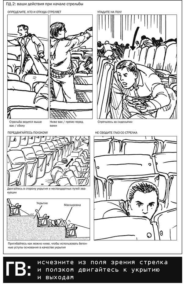Вместо того чтобы инстинктивно следовать за толпой, посмотрите, нет ли других возможных вариантов, причем продумать их следует заранее, еще до развития событий по кризисному сценарию. Тогда вы сможете быстро воспользоваться планом действий в чрезвычайной ситуации, а не разрабатывать его уже после начала событий. Однако перед совершением прыжка внимательно оглядитесь: не пытайтесь покидать таким образом стадион, если находитесь на верхних трибунах. До того как начнете перемещаться, при первых же выстрелах упадите на пол и прижмитесь к нему как можно плотнее, и только после того, как станет ясно, в каком направлении двигается стрелок, действуйте дальше. Инстинкт «беги или сражайся» может заставить окружающих вас людей при начале стрельбы сразу же бежать, не разобравшись в том, что происходит, однако правильный вариант действий — как можно быстрее упасть на пол.
