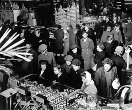 В витринах продовольственных магазинов, как коммерческих, так и тех, в которых все продается по карточкам, выставлены восковые муляжи того, что можно купить внутри. На витринах красуются восковые ветчина, бекон и колбасы, восковые куски говядины и даже восковые банки с черной икрой.