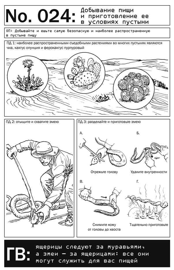 Чтобы поймать змею, найдите длинную, с раздвоением на конце палку и держите наготове острый нож. Раздвоенным концом палки придавите змее голову. Другой рукой, перемещая ее по спине все ближе к голове, схватите пресмыкающееся за челюсти и заставьте его сжать их. В это время тело змеи может извиваться вокруг палки или руки, но это нестрашно: на данном этапе главное — не отпускать голову. Бросьте палку и, по-прежнему удерживая челюсти змеи закрытыми, освободившейся рукой отсеките ей голову ножом.